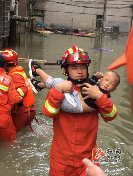 永州消防救援人员从一小区将小孩救出,在消防指战员的怀里,小孩露出了开心的笑容。