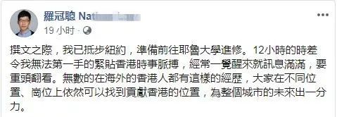 “港独”组织“香港众志”的头目罗冠聪8月14日在社交媒体上发文称,自己已抵达纽约,准备前往耶鲁大学进修。