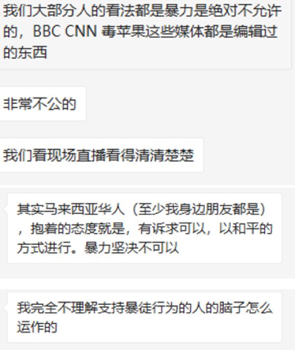 一位接受我们采访的马来西亚网民就表示,这一方面是因为港人虽然有权上街示威提出他们的诉求——正如马来西亚人也可以上街示威一样,但他们绝不该诉诸暴力并坚持与极端分子捆绑在一起,搞“不割席、不谴责”。