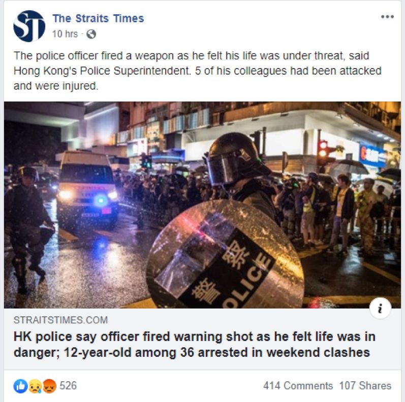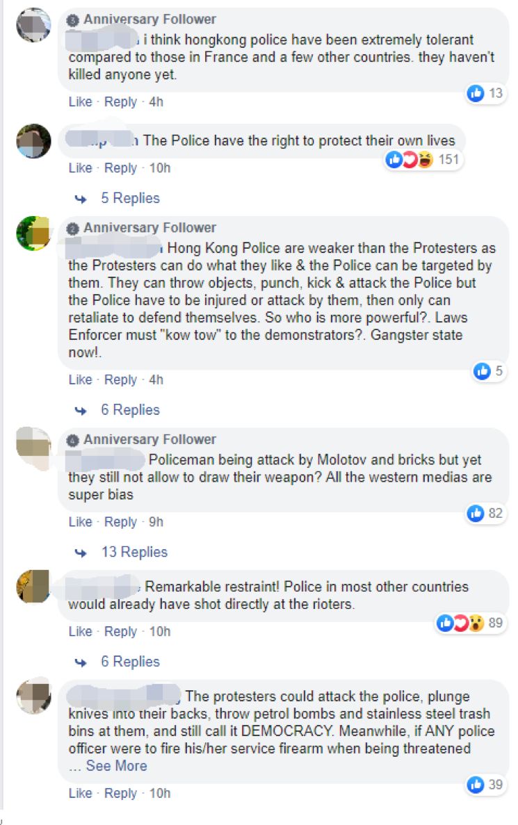 比如,在新加坡《海峡时报》一篇关于“昨晚5名香港警察受伤,遇袭警察鸣枪示警”的报道下面,就有众多新加坡华裔网民纷纷留言,称赞香港警察在面对暴徒恶劣的袭击还能保持“克制”,仅仅是鸣枪示警,这很不容易。