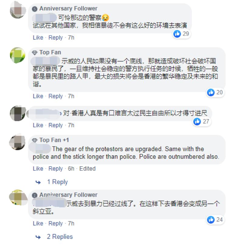 实际上,在海峡时报这篇贴文的评论里,我们发现绝大多数获得大量点赞的评论,基本上都是在支持香港警察和谴责暴徒的。