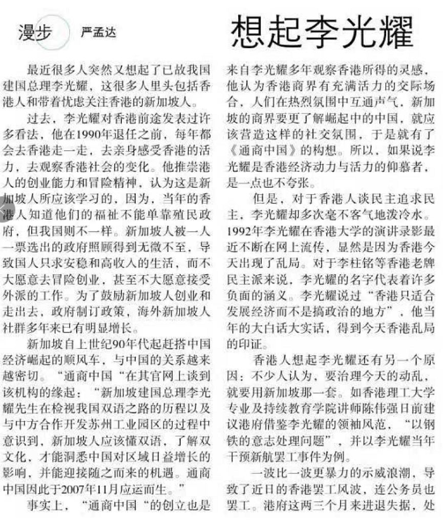 同时,严孟达还在文章中指出,如今香港一些人也会想起李光耀,是因为李光耀当年治理新加坡时的“钢铁意志”,特别是平息新加坡曾经出现的一些动荡的铁腕,这些港人希望港府也能拿出这样的精神去化解问题。