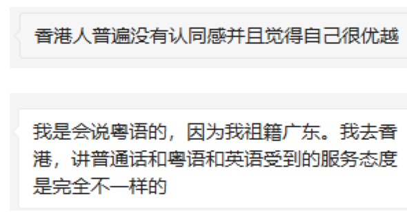 可香港不仅缺乏这种对自己民族的认同感,反而还觉得自己比别人优越。她说,比如她在香港旅游时,就会发现说普通话、粤语和英文在香港会得到完全不同的服务态度。