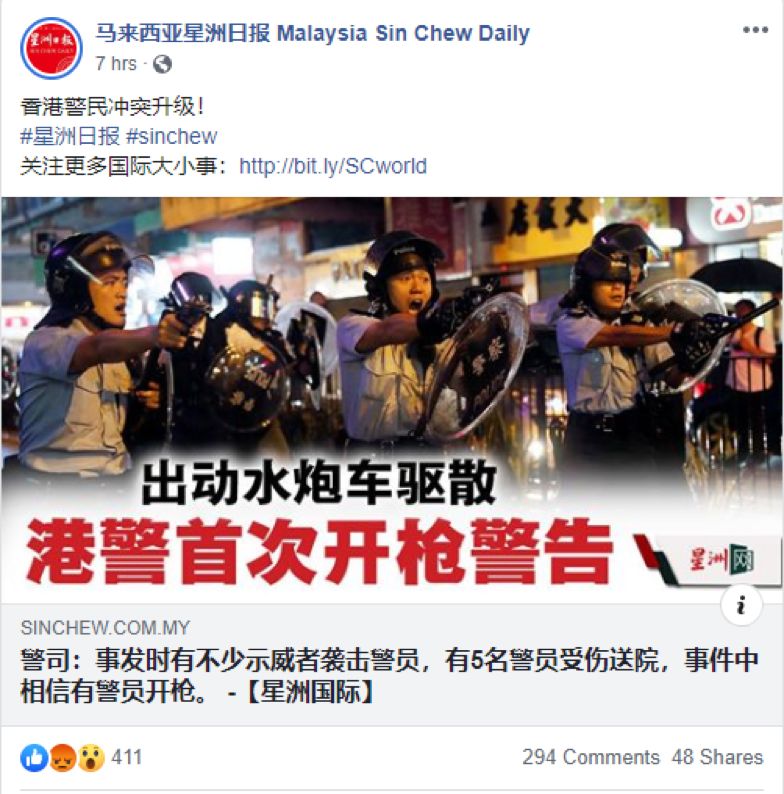 而在马来西亚的主流中文媒体《星洲日报》的社交账号上,我们也发现该报发布的涉及香港暴乱的报道下,同样有大量马来西亚华人在自发声援香港警察。