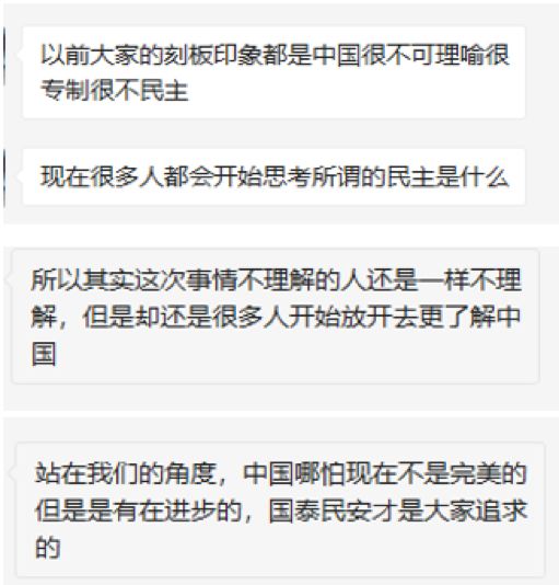 她说,以前大家也会受一些“刻板印象”的影响,会觉得中国有些“不可理喻”,但现在不少人会开始透过香港思考“民主”到底是什么,去希望更深入的了解中国:比如,虽然中国是不完美的,但也是一直在进步的,而国泰民安才是大家的追求。
