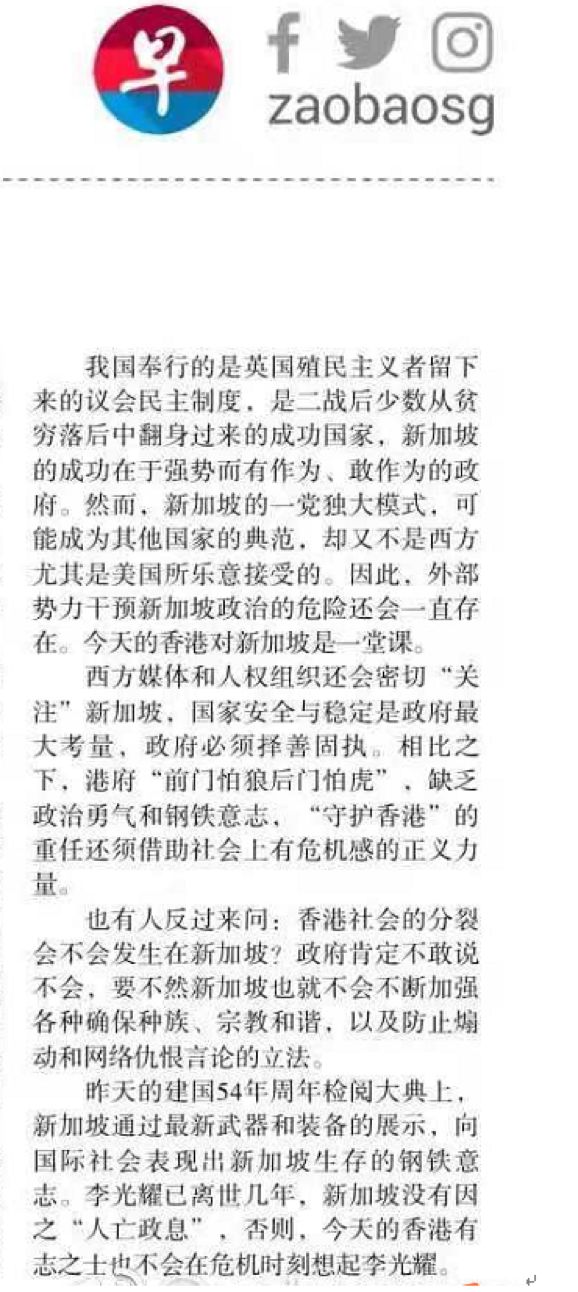 但这篇文章的核心观点,倒并不是说教香港,而是反过来在提醒新加坡要引以为戒,一方面加强自身治理能力,促进社会、民族与宗教和谐,一方面要抵御外部势力的干涉,用“钢铁意志”捍卫新加坡的生存。