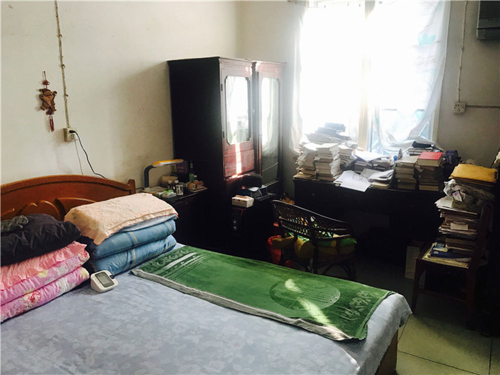 卧室也是书房。当年从武汉带来的书桌,有许多虫蛀的小洞。床上叠放着一件灰色棉袄,这是他最常穿的冬衣,1982年买的。去年,拉链坏了,他用绳子绑一绑,又穿了一个冬天。