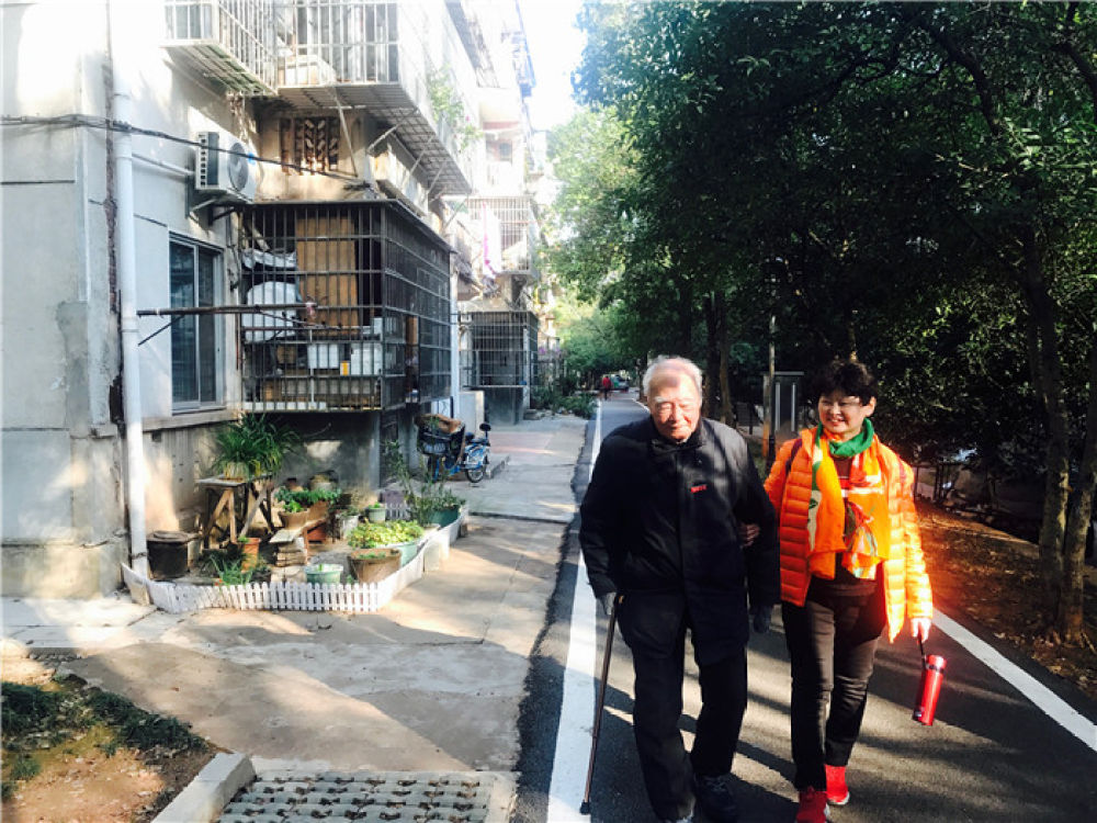 12月9日,沧南在女儿搀扶下,从家中前往教学楼给本科生上课。新华社记者 袁汝婷 摄
