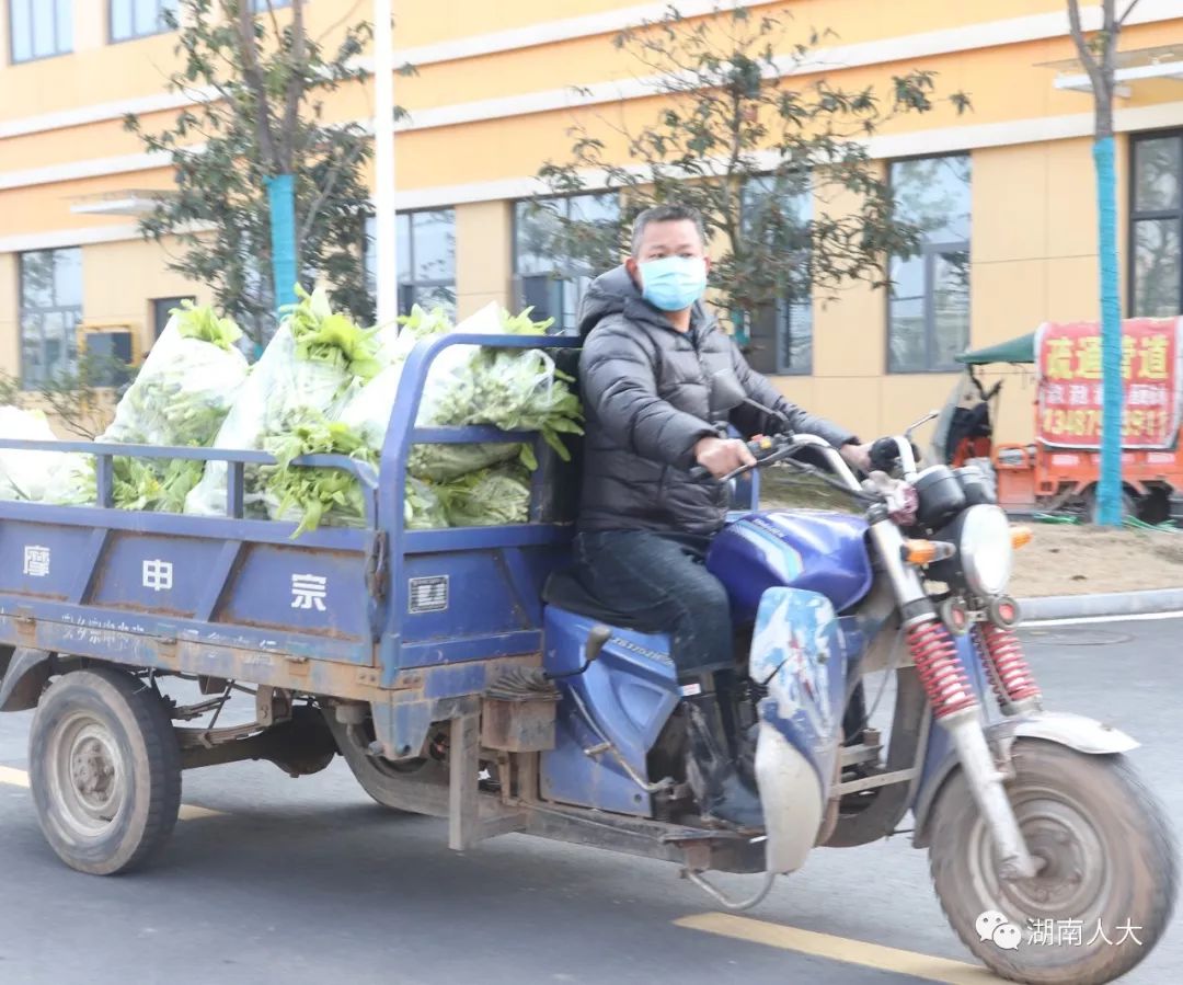 安乡县深柳镇人大代表孙竹清一家老小每天从清晨6点开始,在自家的菜地里采摘多种蔬菜1.5吨,免费送。