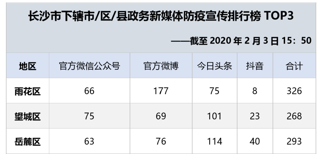 ▲大瀚监测显示,雨花区政务新媒体矩阵疫情相关信息发布总量领先长沙市辖其它市/区/县