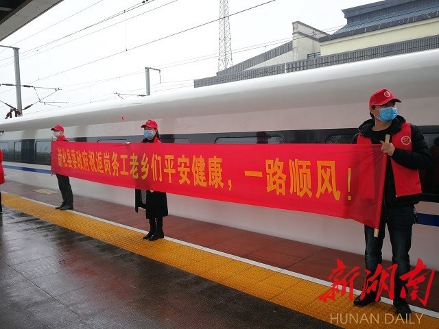 2月22日16时12分,湖南首趟定制返岗专列G4132从怀化高铁南站始发。来自怀化各县市区的791名务工人员乘坐专列,直达浙江义乌返岗复工。