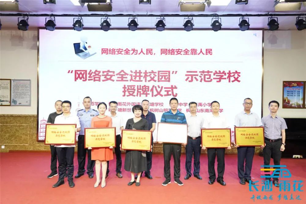 活动现场还为长郡雨花外国语左家塘学校、稻田中学、泰禹小学、砂子塘新世界小学、枫树山明昇小学、枫树山东南海小学六所“网络安全进校园”示范学校进行了授牌。