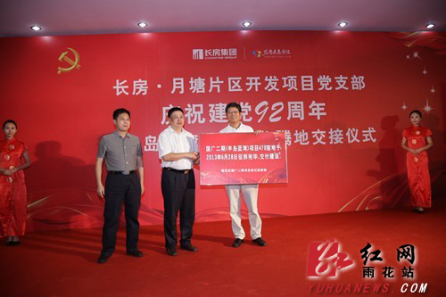雨花区新闻网7月1日讯(通讯员 雨惠)6月29日,雨花区圭塘街道长房·月塘片区开发项目工地上彩旗飘扬,红歌嘹亮, “让党旗在工地上高扬 让党徽在岗位上发光 ”长房·月塘片区开发项目党支部庆祝建党92周年暨半岛蓝湾项目征收腾地交接仪式在此隆重举行。长房集团董事长全臻,区委书记周杏武,区委副书记汪娟,区委常委、组织部长、统战部长冯聪龙,区委常委、区人武部政委、国广二期拆迁指挥部指挥长叶方舟,区政府副县级干部、国广二期拆迁指挥部副指挥长刘建武,以及雨花区圭塘街道全体党政班子成员、国广置业党支部全体党员、长房·月塘片区开发项目党支部全体党员参加活动。