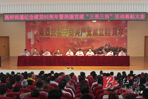 这边的揭牌仪式人潮涌动、热闹非凡,那边的大会现场更是花团锦簇、气氛热烈。街道全体党政成员、大工委兼职委员、机关干部,各社区(筹委会)、非公有制经济组织党组织党员代表,辖区内人大代表、政协委员、工商联分会、商圈商会,驻街站、所、队及驻街单位负责人约600余人齐聚一堂,共同庆祝党的92岁生日。会前,所播放的宣传片,发放的《高桥人》、《高桥梦》宣传画册、报纸更是将大家的党建热情进一步点燃。大会由街道工委副书记、办事处主任李才军主持,会上,街道工委副书记、纪委书记张辉煌宣读了“七一”表彰决定,街道工委书记吴平辉代表街道工委作了题为《勇当标兵、走在前列,努力奏响高桥建设发展的最强音》的大会报告,报告从党的建设、街域经济社会发展等方面全面总结回顾了近年来街道所取得的工作成绩,并提出了要以经济建设为中心、以综合整治为抓手、以民生改善为根本、以作风建设为保障、以基层党建为突破的工作要求。大会还隆重表彰了一批基层党组织、优秀共产党员、优秀党务工作者、党员员工标兵、共产党员示范经营户及规范化非公企业党组织。市委组织部党管处处长何晓芳在讲话指出:近年来,高桥街道工委围绕经济促发展、围绕党建促和谐,为高桥街道经济社会发展提供了坚强组织保障;党组织服务党员,党员服务群众的氛围浓厚;党员立足岗位当先锋,服务群众的意识强。省委组织部党建研究所所长彭江龙对高桥街道的工作给予了高度肯定,并指出高桥街道已步入率先发展的深水区、社会的转型期、项目的攻坚期。面对新形势、新任务,全街广大党员干部要义不容辞地肩负起富民强街的神圣使命,切记思路有多远,出路就有多远;不管走多远,都要记住为何出发;当迷失方向时,不妨回到当初的地方。富有诗意的话语,在全体与会人员中产生了共鸣。区委常委、常务副区长王雄文站在全区的高度,作了重要指示:一是要在坚定理想信念、努力推动转型中,发挥先锋作用;二是要在促进和谐稳定、不断改善民生中,发挥先锋作用;三是要在推动创业富民中,践行党员带头作用,发挥先锋作用。