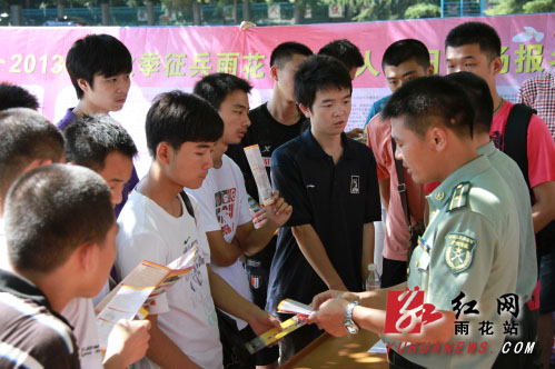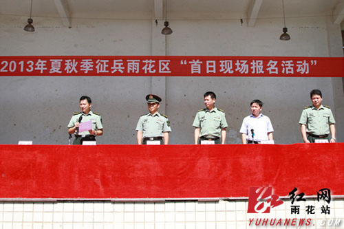 红网雨花站7月10日讯(通讯员 勒伟青) 7月9日,雨花区2013年夏秋季征兵“千人首日现场报名活动”在长沙市环境保护职业技术学院举行,活动吸引了众多大学生前来咨询、报名,环境保护职业技术学院大学生袁明代表全区适龄青年做了发言,表达了全区适龄青年特别是大学生自觉依法服兵役,踊跃报名参军的愿望。