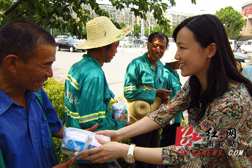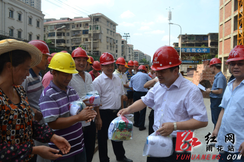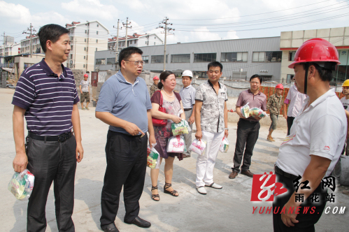 雨花区新闻网7月11日讯(总工会供稿)7月10日下午,在区领导周杏武、邱继兴、汪娟、罗予武、邹犇淼、李国军的带领下,雨花区高温慰问队赶赴一线,慰问在高温下坚守岗位的环卫、园林、市政的一线职工,以及雨花区部分重点工程、保障住房项目的建筑工人和农民工兄弟。雨花区党政领导把一份份高温慰问物资亲手交到广大职工的手上,感谢他们为全区的发展大业所做的贡献,并嘱咐大家一定要做好高温防护工作,确保安全生产。