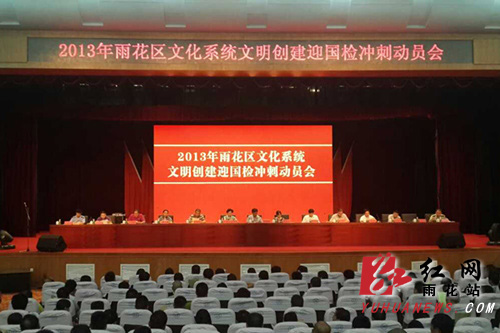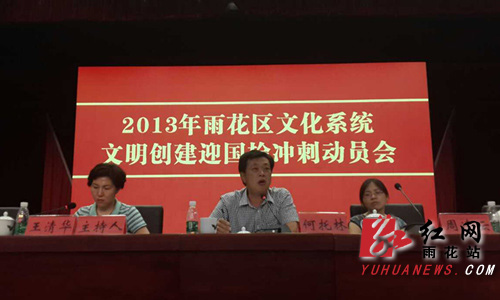 雨花区新闻网8月13日讯(文体新局供稿)8月12日,雨花区召开2013年文化系统文明创建迎国检冲刺动员大会。会议由副区长王清华主持,区委常委、宣传部长何托林,区人大副主任周凌云,区政协副主席廖云伟,区政府副调研员盘正元出席会议。区文明办、区教育局、区文体新局、区卫生局、区安监局、区公安分局、区工商分局、区消防大队等相关职能部门分管领导,各街道分管领导、文化站长及全区文化市场协会、经营业主等400多人参加了会议。