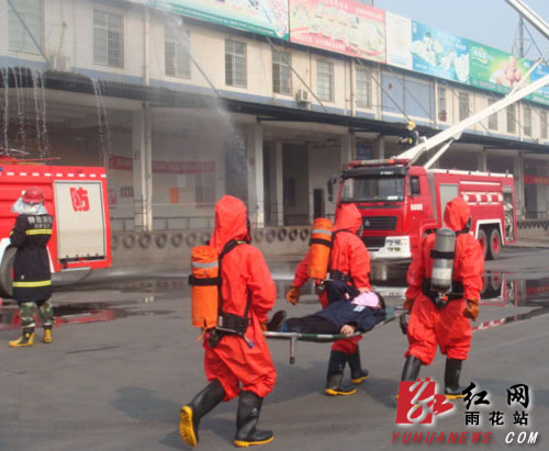 “喂……119,位于雨花区红星冷库市场发生液氨泄漏火灾,请立即派人来救火”,报警声伴随着一阵阵兹兹作响的氨气泄露声,红星冷库消防疏散演习正式开始。烈日当头,红星冷库B栋三楼因管道老化发生液氨管道泄漏,液氨遇电火花引起爆炸,引发火灾,浓烟滚滚,冷库职工快速从大楼内有序疏散到室外,冷库安保部立即组织人员进行初期火灾扑救。启动消防预案、引导职工疏散,关闭防火卷帘形成防火分区,开启室内消火栓出水控火,同时报警求援、关闭电源。单位负责人指挥全体职工在冷库制定区域集结区站队集合、清点人数发现有3人被困,其中两人中毒昏迷;该仓库工作人员立即拨打119、110、120报警。辖区消防大队迅速赶赴现场,成立应急救援指挥部,并调公安、质监、卫生、环保等单位到场联合参与处置。