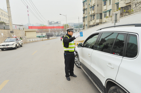 昨日下午3时,执勤交警正在万顺路劝导驾驶员将车开到停车场停放。陈飞 摄
