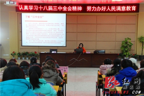 红网雨花站2月17日讯(教育局 供稿)根据区委组织部《关于开展十八届三中全会精神主题宣讲活动的通知》的精神,为在教育系统迅速兴起学习宣传贯彻党的十八届三中全会精神的热潮,让三中全会精神更好的为广大党员干部、教职工所理解、所掌握、所贯彻,春季开学预备周期间,区教育局党委组织开展了四场十八届三中全会精神宣传活动,邀请了市委十八届三中全会精神宣讲团成员姚庆武、余敏两位教授进行专题授课。全体机关干部,二级机构、中小学、幼儿园全体行政干部、党员教师1400余人参加了十八届三中全会精神主题宣讲活动。