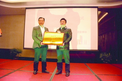 雨花区区委书记邱继兴将“雨花区金融业示范楼宇”牌匾颁发至顺天集团董事长苏松泉手中。