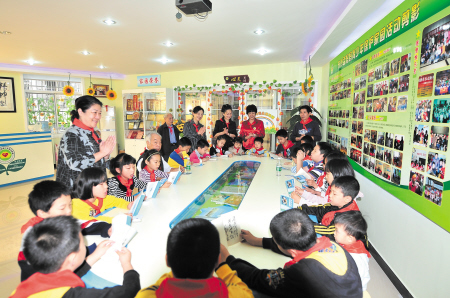 孟妈妈(图左站立合掌者)和志愿者一起,在自己的青少年保护家园带孩子们读书。 刘麟 谢瑶供图 刘麟 谢瑶