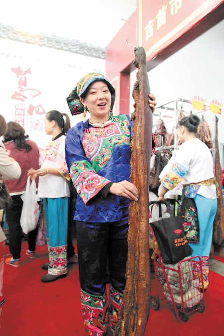 农博会上大多是卖鸡鸭鱼肉、鲜蔬果品的,居然有人在这售楼卖宅院,难道成了房交会?在湘西吉首农业合作社联合展位旁边,就有一栋“苗家唐宅小院”待售,连一头耕牛在一起,叫价两万元,你买不?
