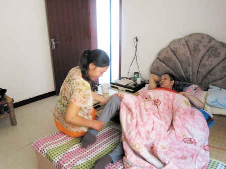 王芳做完环卫工作下班回家后,在帮丈夫按摩。资料图片 熊远帆