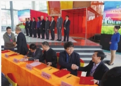 新街市集团与流沙河花猪生产企业——沙龙畜牧在农博会上共同签署合作协议。