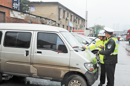 昨日在石坝路西段整治现场,执法队员清理违法停车位。 余志雄 摄