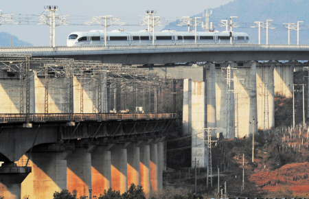 近日,一辆高铁试验列车行驶在横跨浙赣铁路桥的沪昆高铁浙江义乌东特大桥上。新华社发