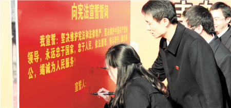 首个国家宪法日宣传现场,雨花区新任法官、检察官在宣誓词展板上庄重签名。 资料图片