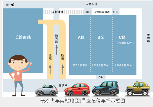 应急停车场建成后,如何停车以及进出车站?交警表示,当站区出现客流高峰,车流量大,车辆行驶缓慢时,位于湘秀路与花侯路交会处东南角和西北角的应急停车场将免费向社会开放。车辆经由花侯路的入口到达停车场,然后由东边两个出口驶出,经应急路单向行驶至香樟路。旅客可从应急停车场下车后,经湘秀路,左转进火车南站南广场应急通道进站。