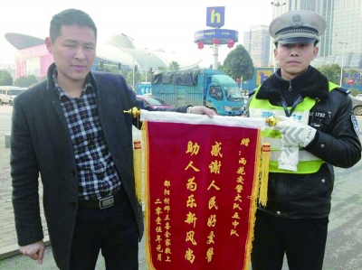 2月9日,吴先生送锦旗给交警韩敦云,感谢开道护送使母亲得到及时救治。