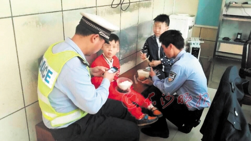 昨日中午,两个“熊孩子”迷路又饿肚子,交警把自己的饭端给他们吃。 长沙晚报通讯员 朱尚武 摄