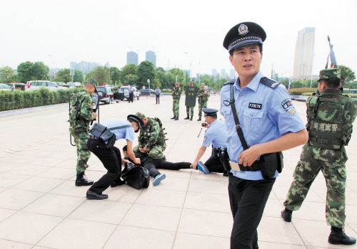 这场演习只是长沙火车南站在全省率先实施公安武警联勤武装巡逻模式的一个缩影。今年以来,长沙火车南站地区客流急剧上升,预计全年客流量达4000万人次以上,日均旅客到发12万人次,节假日高峰约20万人次,反恐防暴等形势严峻紧迫。为力保平安,长沙火车南站在全省率先实施公安武警联勤武装巡逻勤务模式,由公安民警和武警特战队员联合在站场内外巡逻,车巡和步巡结合。车巡组主要是对火车南站外围及落客平台进行巡查,车巡组公安民警携带有79式微冲、92式手枪、防暴钢叉、警棍盾牌及常用“八大件”等防暴装备器材;武警官兵携带有“10毫米防暴枪、03式突击步枪、爆震弹、催泪弹、警棍盾牌”等装备器材。步巡组主要是对站前广场、售票厅等区域进行巡查,均携带有各类防暴装备器材。