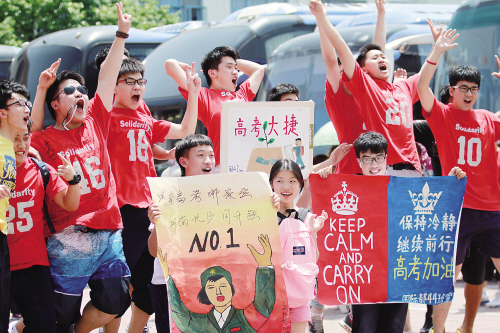 长沙同升湖实验学校组织爱心送考车送学生入考场。高一高二的学弟学妹们来送行,已经成为学校的传统。长沙晚报记者 岳霞 摄