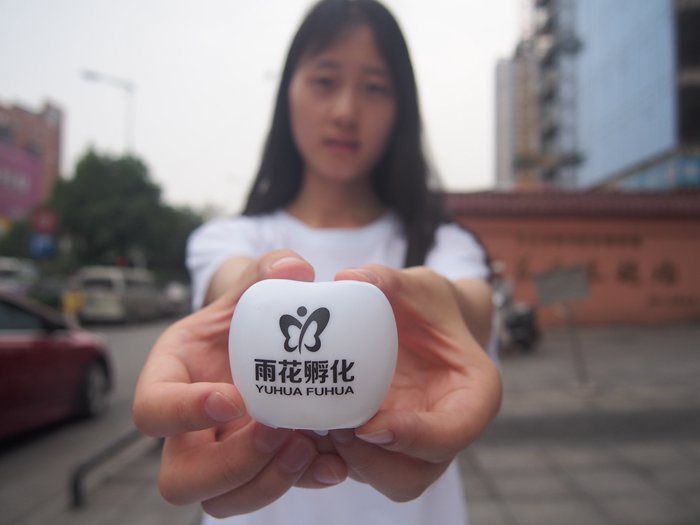 雨花区社工孵化中心的美女志愿者用手工艺品展示机构公益理念