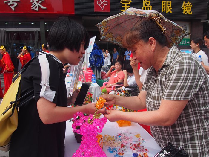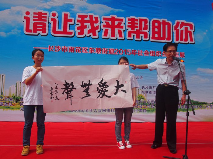 在活动现场,社会公益组织们使出浑身解数,充分展示自身工作内容和成果,广泛招纳志愿者加入。在“老首长工作室”展台前,老将军龙飞凤舞,以苍穹有力的笔锋书写出“大爱无声”的书法作品,意在为活动献上完美注解,引得居民群众连连叫好;“名源健康哨所”的老中医们现场开展把脉坐诊,为居民群众解答健康疑问,并发放防暑降温药品;以扶残助残著称的“慈爱公益”赵继云妈妈则现场带着居民朋友制作起爱心小手工艺品,并开展现场爱心义卖。长沙最负盛名的“金牌帮女郎”工作室则在现场为他们的绿色环保回收新项目:“绿色湘依”而奔波忙碌,一袋又一袋干净整洁的旧衣服被居民们送来,满载着大家对山区儿童的关心和爱护。