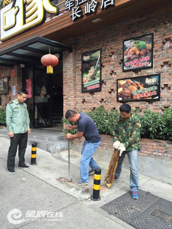 (街道执法人员正对违规停车地锁进行拆除。图片由 刘佳 摄)
