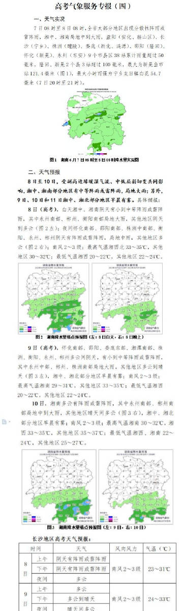9日(高考),怀化南部、邵阳、娄底东部、湘潭南部、株洲、衡阳、永州、郴州多云间阴天,有小到中等阵雨或雷阵雨,其中永州中部、郴州、株洲南部局地大雨,其他地区多云到晴天(图3),湘中、湘北部分地区早晨有雾;南风2~3级;最高气温湘南29~31℃,其他地区33~35℃;最低气温湘西20~22℃,其他地区22~24℃。