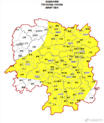 #湖南高温黄色预警发布# 【#湖南12市将出现35℃以上高温# 】湖南省气象台7月1日16时发布高温黄色预警:预计1日20时至2日20时,长沙、株洲、湘潭、衡阳、邵阳北部、岳阳、常德、益阳、郴州、永州、怀化中部、娄底将达到35℃以上高温,局部地区将达37℃以上,请做好防范。