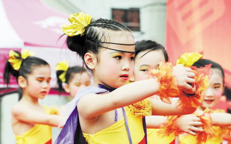 —分享— 昨日,雨花区高桥街道友谊社区举办首届社区文化节,舞蹈、独唱、红歌联唱、爵士舞等20多个精彩节目全部由孩子们表演,让她们过了一回当主角的瘾。图为一群四五岁的小女孩在表演歌舞《花木兰》。 贺文兵 摄 作者:萧婷 编辑:周哲文