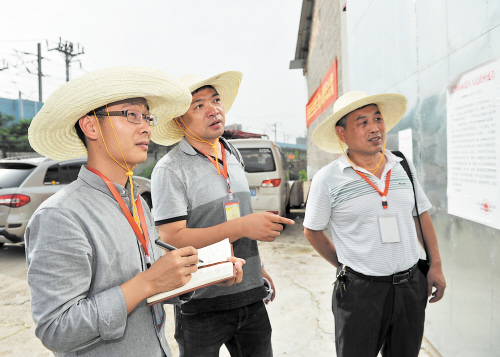 昨日下午,雨花区平阳三角洲分片区,李铭水(左)和同事们冒着高温在进行违建信息调查登记。长沙晚报记者 王志伟 摄