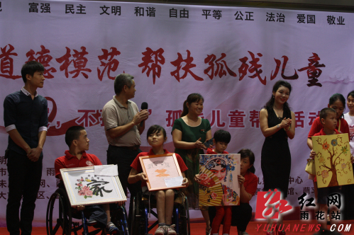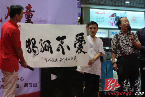 红网雨花站8月20日讯(通讯员 雨惠)“爱,不孤独!”当知名书画家侯观环先生写下这幅书法作品,赠送给长沙彩虹孤残儿童服务中心时,现场响起了热烈的掌声。8月19日上午,长沙“关爱帮扶孤残儿童”主题活动,在雨花区高桥街道高桥现代商贸城“高调”举行。现场展出的孤残、智障儿童的手工品、书画,吸引了数百名市民驻足观看和认购。
